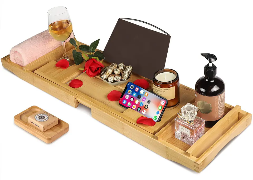 Półka na wannę HALIA bambusowaPrzeznaczenie: łazienka | Kolory: naturalny bambus Starannie wykonana, ze 100% naturalnego bambusa. Zachwyci Cię jakością i dbałością o każdy detal. Jej najważniejsze cechy to dbałość o detale i perfekcja wykonania.Liczne uchwyty i półeczki pozwolą Ci w pełni zaznać uroków kąpieli i mieć wszystko na wyciągnięcie ręki. Elementy półki1 - Półka uniwersalna2 - Gniazdo na kieliszek wina3 - Składany uchwyt na tablet, książkę4 - Mocny materiał podtrzymujący5 - Gniazdo na świecę6 - Półka uniwersalna7 - Gniazdo na telefon8 - Mydelniczka Wymiary produktuSzerokość regulowana od 75 cm do 111 cmGłębokość 23 cmWysokość 4,5 cmPółka uniwersalna: 20 cm x 8,5 cmGniazdo na świecę: 9 cmUchwyt na tablet 26 cm x 17 cmMydelniczka 12 cm x 8 cmUdźwig maksymalny półki to 5 kg Informacje dodatkowePrzedstawione kolory należy traktować poglądowo - mogą odbiegać od rzeczywistych ze względu na różne ustawienia monitorów oraz proces obróbki zdjęć. Rzeczywiste wymiary mogą się różnić od podanych wyżej. Tolerancja błędów może wynosić +/- 5%.Marka:GockowiakKod EAN:323168MGKolor:naturalny bambusWysokość: 4,5 cmSzerokość:75 - 111 cmGłębokość:23 cmUdźwig półki:5 kg