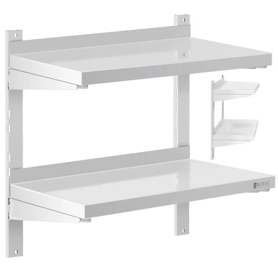 Kod producenta: 10011454Półka wisząca nierdzewna Royal Catering idealnie sprawdzi się w twojej kuchni, za sprawą pojemnych blatów o długości 60 cm i głębokości 30 cm, pomieści dużą liczbę przypraw, składników, małych sprzętów kuchennych czy środków czystości. Otwarta konstrukcja umożliwia łatwe użytkowanie (zdejmowanie, odkładanie). Montaż ścienny ułatwia ekonomiczne zagospodarowanie każdego wnętrza. Półka została wyposażona w 2 wytrzymałe blaty o grubości 3,5 cm i udźwigu każdy do 20 kg. Szyny mocujące pozwalają samodzielnie regulować ich wysokość. Półki od spodu wzmocnione zostały wspornikami. Kuchenna półka wisząca została wykonana ze stali nierdzewnej. Jest odporna na zarysowania, wgniecenia, otarcia i inne uszkodzenia mechaniczne. Materiał charakteryzuje się wysoką odpornością na proces korozji, a gładka powierzchnia i zaokrąglone krawędzie są łatwe w czyszczeniu.Cechy produktu: