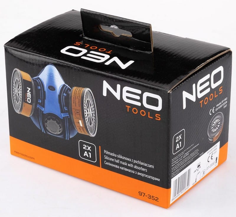Półmaska silikonowa + 2x pochłaniacz A1, 97-352 marki NEO TOOLS to zestaw obejmujący półmaskę silikonową 97-350 NEO TOOLS oraz dwa pochłaniacze A1, 97-360 NEO TOOLS.