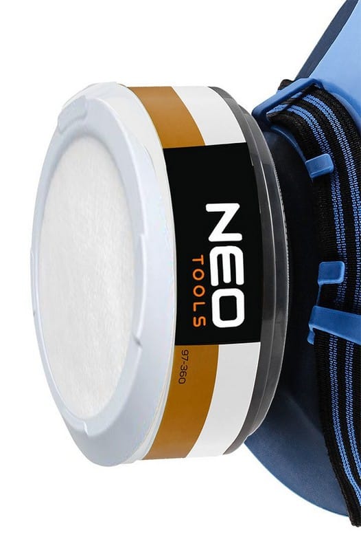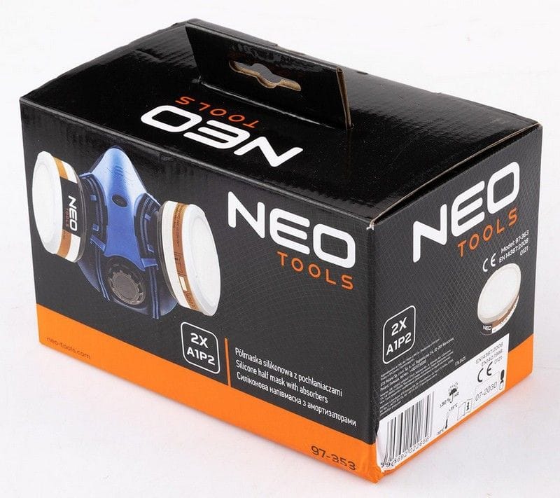 Półmaska silikonowa + 2x pochłaniacz A1P2, 97-353 marki NEO TOOLS to zestaw obejmujący półmaskę silikonową 97-350 NEO TOOLS oraz dwa pochłaniacze A1P2, 97-363 NEO TOOLS.