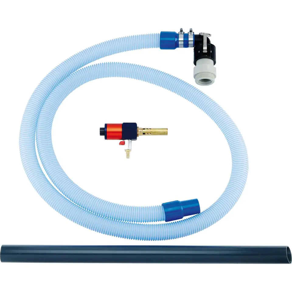 Wykonanie: dwufunkcyjna pompa ssąca i tłocząca do napełniania lub opróżniania zbiorników cieczy chłodzących i smarujących. Pompę należy przykręcić do otworu beczki, a następnie podłączyć do sprężonego powietrza. Automatyczny zawór samozamykający, który służy do kontroli wlotu i wylotu cieczy, zapobiega jej przelaniu. Dostawa z rurą zgłębną, 2-calową złączką wtykową, szybkozłączką, wężem odprowadzającym 3 m i rurą ssącą.