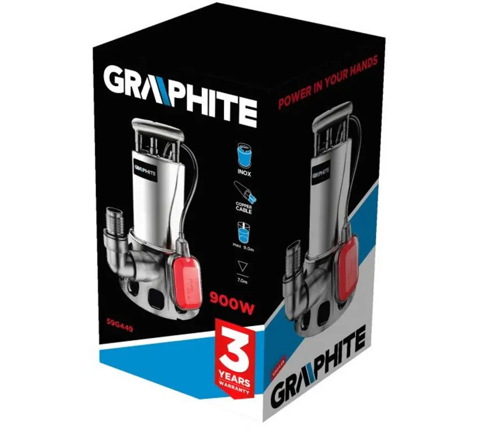 Pompa zanurzeniowa do wody brudnej 900W, wydajność 17000 l/godz., średnica zanieczyszczeń 20 mm, wys. podnoszenia wody 9 m, gł. zanurzenia 8 m, min. rozmiary szybu (LxWxH) 65 x 65 x 50 cm, średnica króćca do przewodu wodnego 2, 1 1/2, stopień ochrony IP68, przewód 10 m, obudowa INOX, (LxH) 210 x 340 mm, masa 7.8 kg, akcesoria: 2 króćce, 2 złącze, 2 korki zaślepki