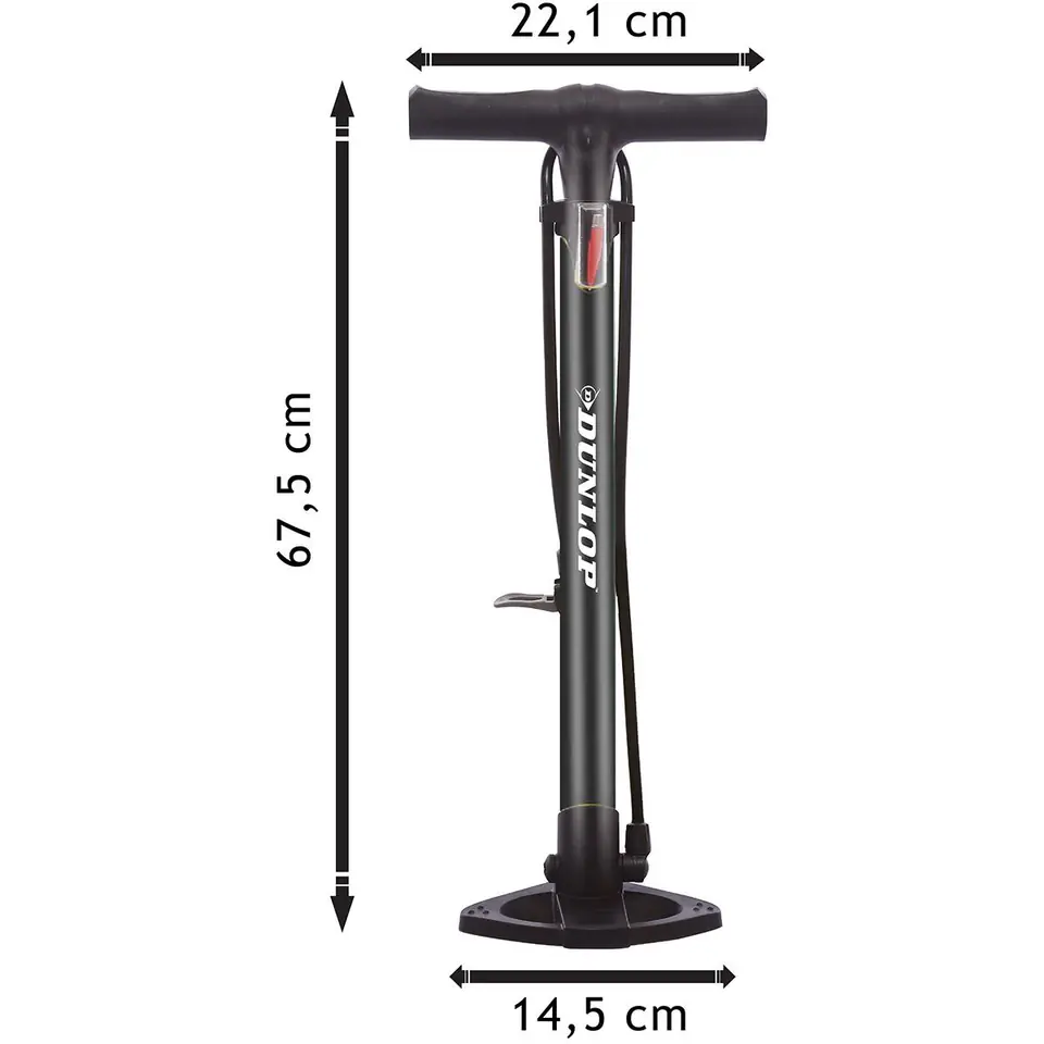 - Kolor: CzarnyMateriał: Tworzywo sztuczne, stalTyp pompy rowerowej: Pompka podłogowaObsługiwane zawory: Schrader, Presta, DunlopMaksymalne ciśnienie: 12 barManometr: NieMinimalna wysokość: 59 cmMaksymalna wysokość: 101 cmWymiary rączki: 22,5 x 3 cm (dł. x śr.)Wymiary podstawy: 16 x 16 cm (szer. x dł.)Długość węża łączącego: 81 cmWaga brutto: 0,900 kgPojemnik na akcesoria: Tak (2 modele igieł)Marka: Dunlop
