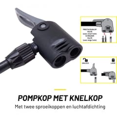 - szerokie uchwyty zapewnią wygodne pompowaniespecjalna stopki pozwolą wygodnie ustawić stopy w celu unieruchomienia pompkikompatybilna z trzema rodzajami wentyli: Schrader, Presta, Dunlopwyposażona w specjalne zapięcie zaciskające się na wentyluposiada w duży manometr do 16 Bar i 230 PSIz podwójną głowicą