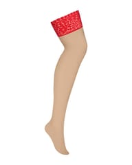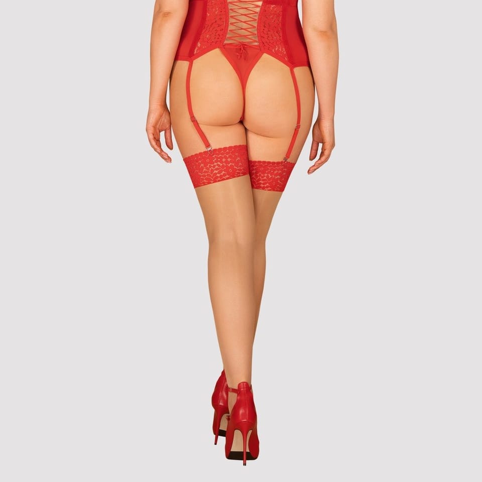 Cieliste pończochy przeznaczone do paska, z piękną, czerwoną koronką umieszczoną wysoko na udzie. Dostępne również w większym rozmiarze. Skład: 89% poliamid, 11% elastan.