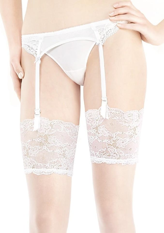 Pończochy mocowane do paska, koronka bez silikonu, bezpalcowe. Grubość: 20 den. Skład: 84% poliamid, 16% elastan.