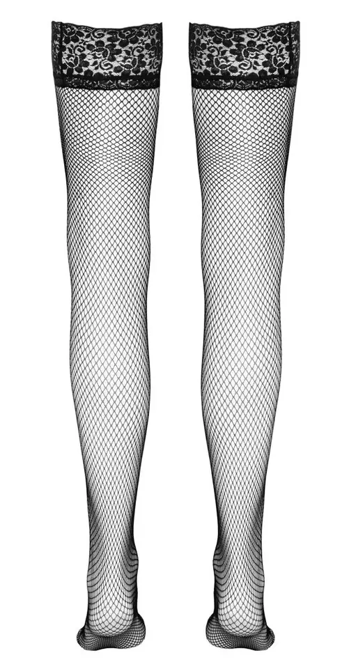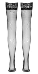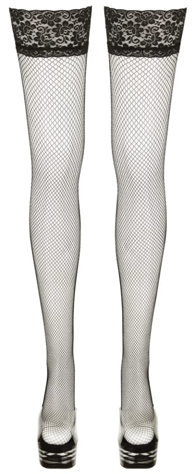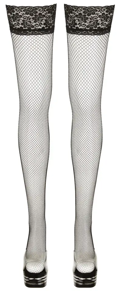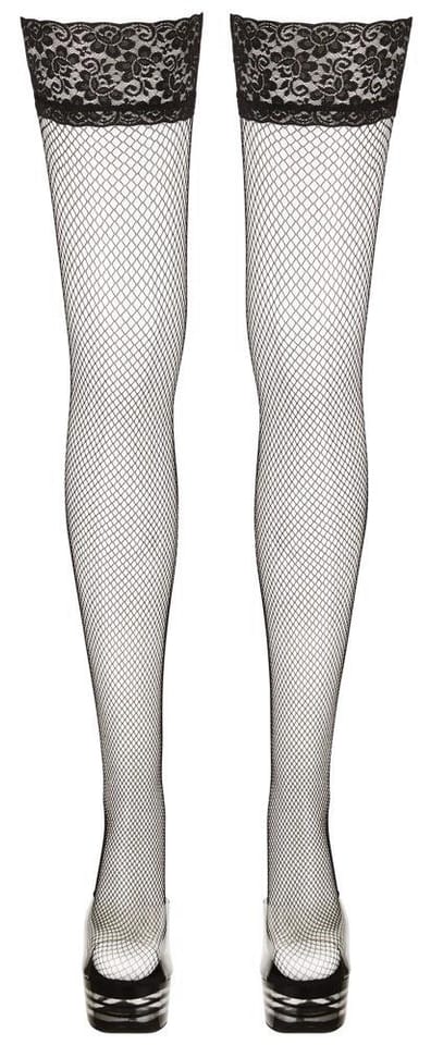 Czarne samonośne pończochy kabaretki z szeroką koronką (10cm). Silikonowa taśma po wewnętrznej stronie koronki zapewnia zapewnia ideane dopasowanie. Skład: 85% poliamid, 15% elastan.