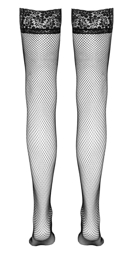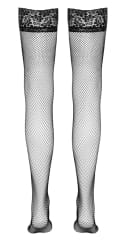 Czarne samonośne pończochy kabaretki z szeroką koronką (10cm). Silikonowa taśma po wewnętrznej stronie koronki zapewnia zapewnia ideane dopasowanie. Skład: 85% poliamid, 15% elastan.