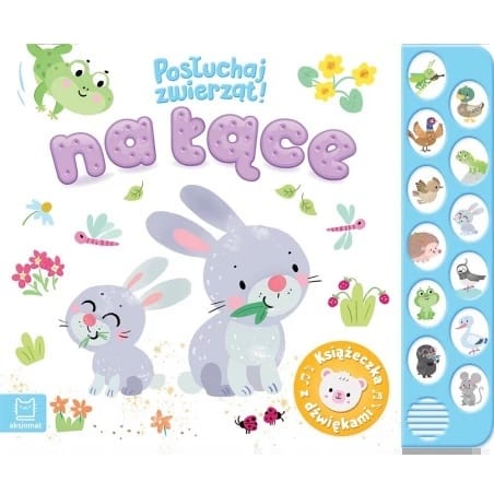 Książeczka z dźwiękami dla małych miłośników zwierząt, a w niej bogate, pastelowe ilustracje odpowiednie dla małych dzieci i krótkie, wpadające w ucho wierszyki o lubianych przez dzieci zwierzakach. Miłą niespodzianką są dołączone dźwięki zwierząt z łąki. Można posłuchać, jakie odgłosy wydają: pasikonik, kaczka, bażant, jaszczurka, przepiórki, zające, jeż, czajka, żaby, bocian, kret, myszy. Naciśnij przycisk z obrazkiem, aby włączyć dźwięk. Chcesz wyłączyć? Naciśnij przycisk jeszcze raz. Zabawa z książką rozwija zmysły malucha. Wesołe i łatwe do zapamiętania wierszyki rozwijają pamięć i percepcję dziecka, które wzbogaca również swoją wiedzę o odgłosy wydawane przez zwierzęta z łąki. Twarda oprawa i kartonowe karty sprawiają, że książka jest trwała i bezpieczna, a format odpowiedni dla małego dziecka. „Posłuchaj zwierząt” to książka do czytania, słuchania i oglądania!