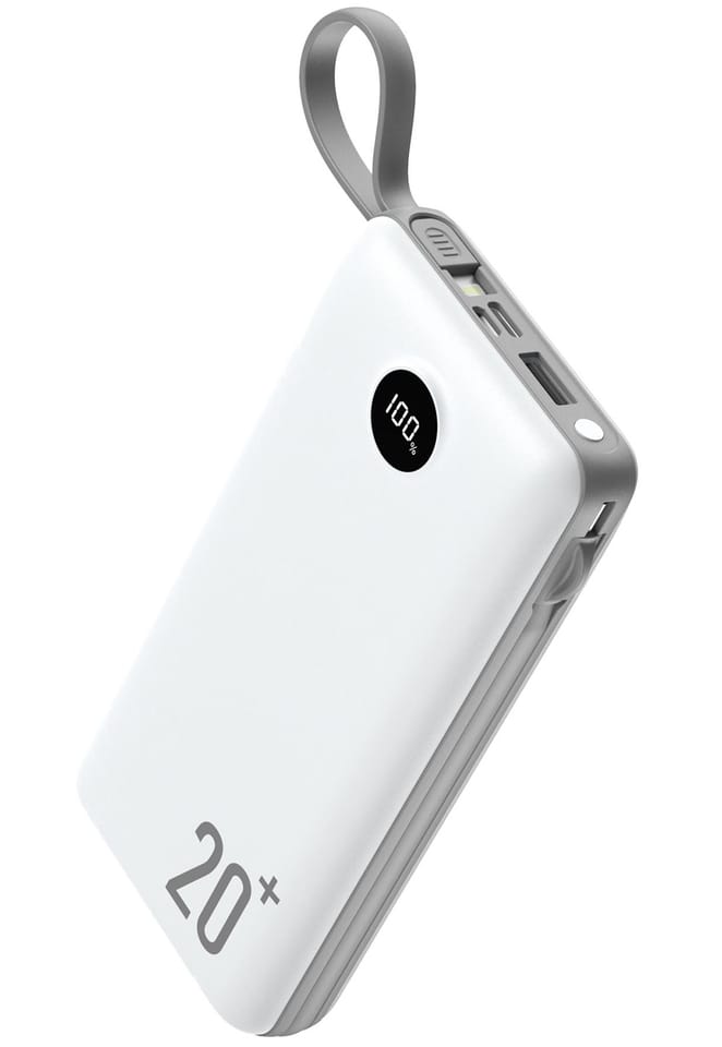 Wbudowane kable - Power bank posiada w zestawiedwa kable: dłuższy odłączany USB - micro USB / USB typ-C, krótszy wbudowany Apple Lightning