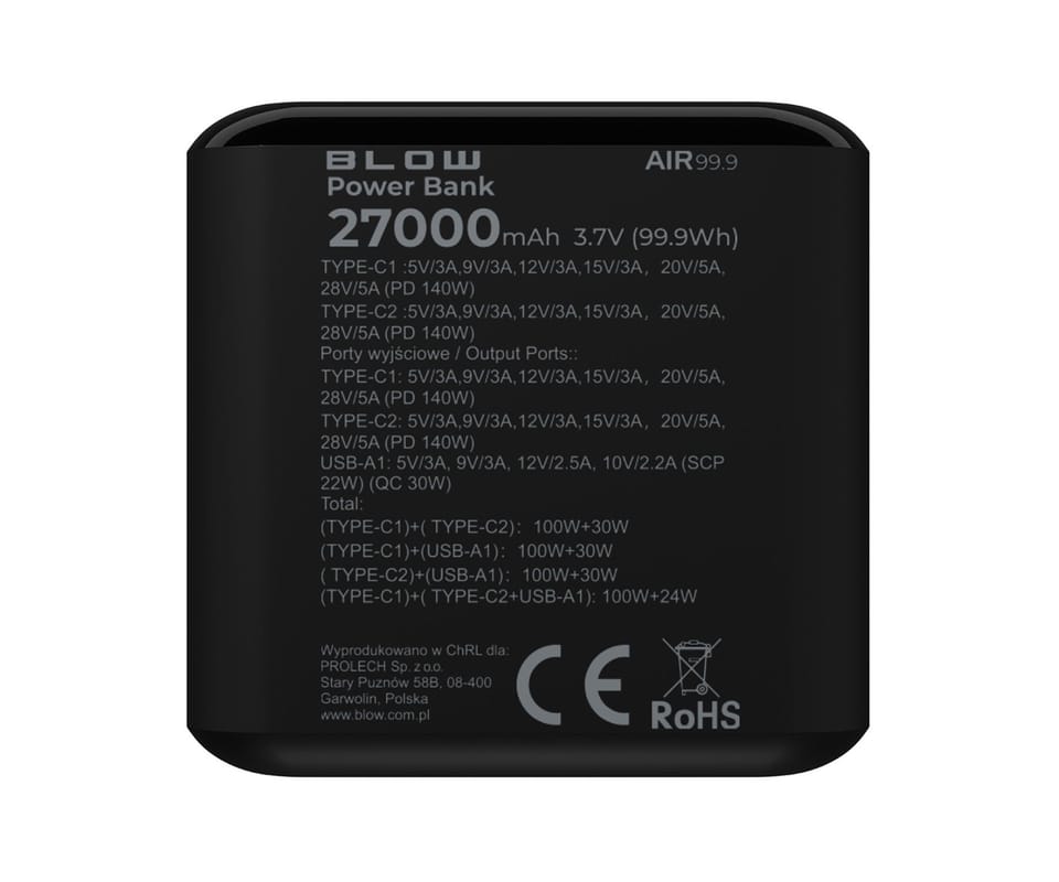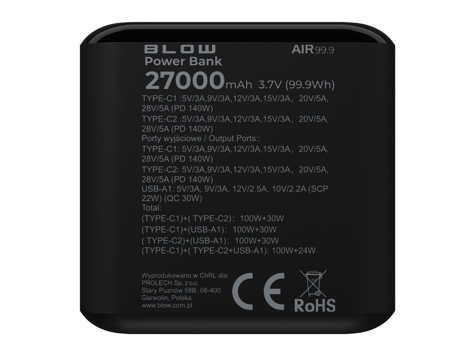 1 x Powerbank 27 000 mAh 1 x kabel do ładowania USB-C 32cm 1 x instrukcja obsługi PL EN