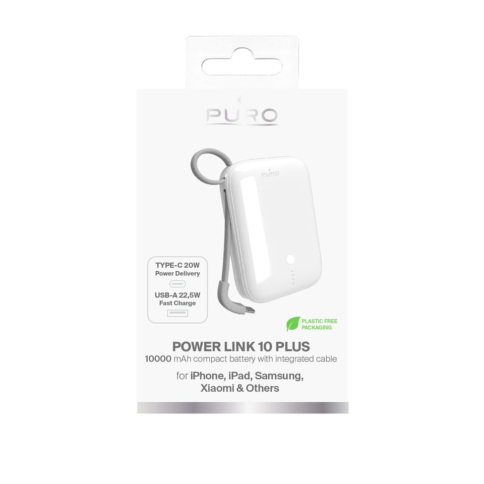 Kod produktu: 1029433Powerbank Puro Power Link 10 Plus to doskonałe rozwiązanie dla osób, które oczekują wygody i wysokiej wydajności w kompaktowej formie. Dzięki pojemności 10000 mAh możesz cieszyć się nawet pięcioma pełnymi ładowaniami swojego smartfona, gdziekolwiek jesteś. Zintegrowany kabel USB-C z obsługą technologii Power Delivery 20W eliminuje konieczność noszenia dodatkowych akcesoriów - wystarczy podłączyć urządzenie i cieszyć się szybkim ładowaniem. Dodatkowe porty USB-A i USB-C umożliwiają jednoczesne ładowanie kilku sprzętów, co czyni go niezwykle praktycznym towarzyszem podróży i pracy. Dzięki dołączonemu kablowi USB-C łatwo doładujesz również sam powerbank. Smukła, minimalistyczna obudowa i biały kolor sprawiają, że urządzenie prezentuje się elegancko i nowocześnie.Najważniejsze cechy: