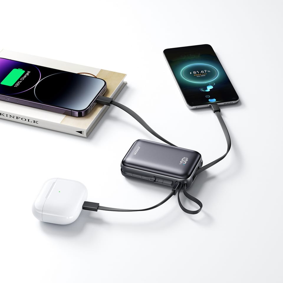 - - Port USB-C oraz dwa wbudowane kable umożliwiają jednoczesne zasilanie nawet trzech urządzeń. To praktyczne rozwiązanie w podróży i podczas intensywnego dnia poza domem.