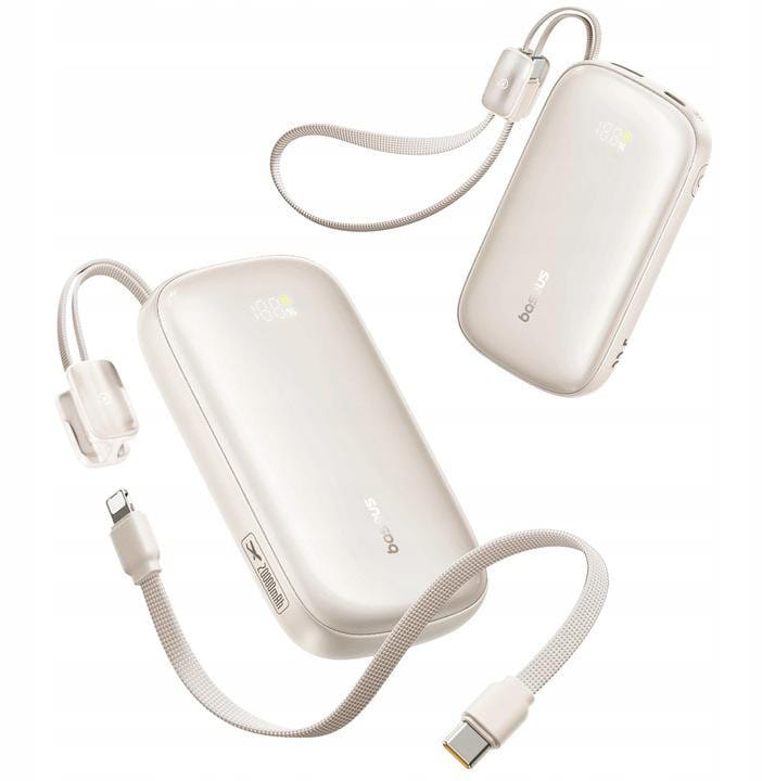 Kod produktu: 1031613Baseus EnerFill FC21 Qpow3 Ultra to pojemny i szybki powerbank 20000mAh z wbudowanym odłączanym przewodem 2-w-1 oraz czytelnym wyświetlaczem LED. Umożliwia ładowanie iPhone'ów z portem Lightning (serie do iPhone 14) oraz iPhone'ów z USB-C i urządzeń Android za pomocą końcówki USB-C. Dzięki mocy 22.5W i trzem portom można ładować kilka urządzeń jednocześnie. Wersja w eleganckim beżowym kolorze wyróżnia się nowoczesnym wyglądem i wysokiej jakości wykończeniem.Cechy produktu: