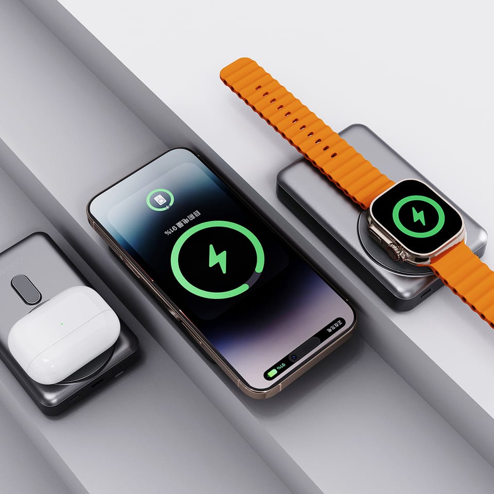 - - Ładuj aż cztery urządzenia jednocześnie - Dzięki wbudowanym kablom, gniazdu USB-C i ładowaniu bezprzewodowemu, możesz dzielić się energią z innymi.