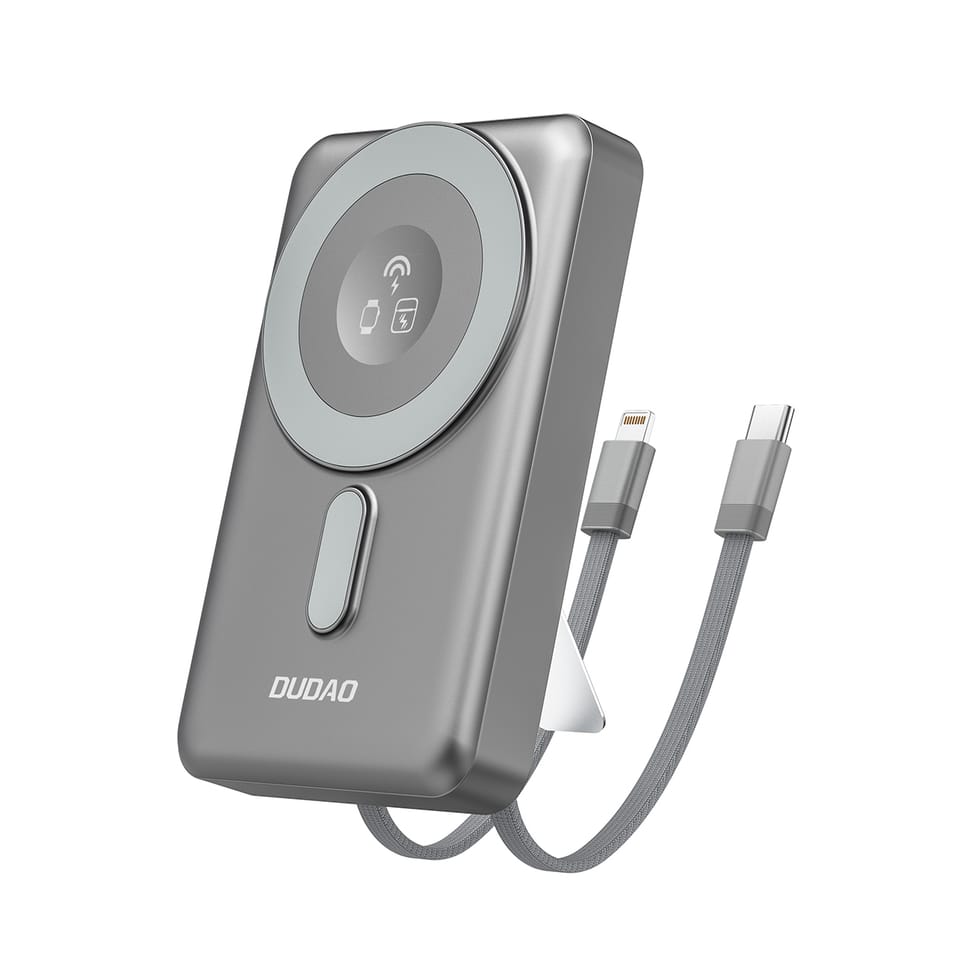 Kod produktu: 1028150Powerbank Dudao K29 to połączenie elegancji, innowacyjnych rozwiązań i wydajności, jakiej potrzebujesz na co dzień. Dzięki pojemności 10000mAh oraz dwukierunkowemu ładowaniu z technologią PD 20W na porcie USB-C, naładujesz swoje urządzenia szybciej niż kiedykolwiek. Wbudowane kable USB-C i Lightning pozwalają zapomnieć o dodatkowych przewodach, a do tego możesz ładować aż cztery urządzenia jednocześnie – przewodowo i bezprzewodowo! Metalowa obudowa i wysuwana podstawka z MagSafe 15W gwarantują komfort użytkowania i trwałość. Urządzenie spełnia normy transportowe dla samolotów i kolei dużych prędkości, co czyni je niezastąpionym towarzyszem podróży. Niezwykle smukły, stylowy i praktyczny - Dudao K29 to niezawodny wybór dla każdego, kto ceni nowoczesność i wygodę.Dwukierunkowe szybkie ładowanie PD 20W z USB-C w jednym porciePowerbank Dudao K29 obsługuje szybkie ładowanie oraz szybkie ładowanie zwrotne przez ten sam port USB-C - do 20W przy wyjściu i 18W przy wejściu. To oszczędność czasu i wygoda w codziennym użytkowaniu, zwłaszcza gdy liczy się każda minuta.Możliwość ładowania aż czterech urządzeń jednocześnieZadbaj o siebie i swoich bliskich - Dudao K29 pozwala ładować dwa urządzenia kablami, jedno przez port USB-C oraz jedno bezprzewodowo. Komfort, którego potrzebujesz w podróży i w domu.Magnetyczna podstawka i silny MagSafe 15WWbudowana metalowa podstawka umożliwia wygodne ustawienie telefonu podczas ładowania, a mocny MagSafe utrzymuje go pewnie w miejscu. Idealne rozwiązanie do wideorozmów czy oglądania filmów.Solidna metalowa konstrukcja i elegancki designObudowa wykonana z metalu nie tylko zwiększa trwałość urządzenia, ale też sprawia, że prezentuje się nowocześnie i prestiżowo - niezależnie od okazji.Wbudowane kable USB-C i Lightning - zawsze gotowe do działaniaZapomnij o plączących się przewodach - Dudao K29 posiada dwa wbudowane, trwałe kable (plecione), które umożliwiają szybkie i wygodne ładowanie większości urządzeń mobilnych.Najważniejsze cechy: