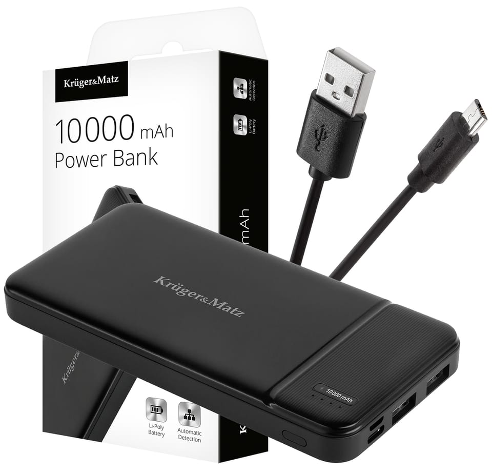 Jeśli Twoja praca wymaga od Ciebie częstego korzystania z urządzeń mobilnych w terenie, gdzie masz ograniczony dostęp do prądu, warto zawsze mieć pod ręką power bank. Kruger&Matz KM0903, dzięki dużej pojemności 10 000 mAh swobodnie naładuje Twój smartfon, tablet oraz wiele innych urządzeń. Dzięki dwóm portom USB KM0903 pozwoli Ci naładować jednocześnie dwa urządzenia. Wystarczy podłączyć kabel, a urządzenie samo wykryje połączenie i rozpocznie pracę. Power bank Kruger&Matz posiada szereg zabezpieczeń: przed przepięciem, przeciążeniem, przeładowaniem, głębokim rozładowaniem, a stan jego baterii możesz kontrolować dzięki czterem diodom umieszczonym na czarnej, solidnej obudowie. Wejścia USB typu C i micro USB pozwalają na komfortowe ładowanie urządzenia za pomocą wybranego typu kabla.