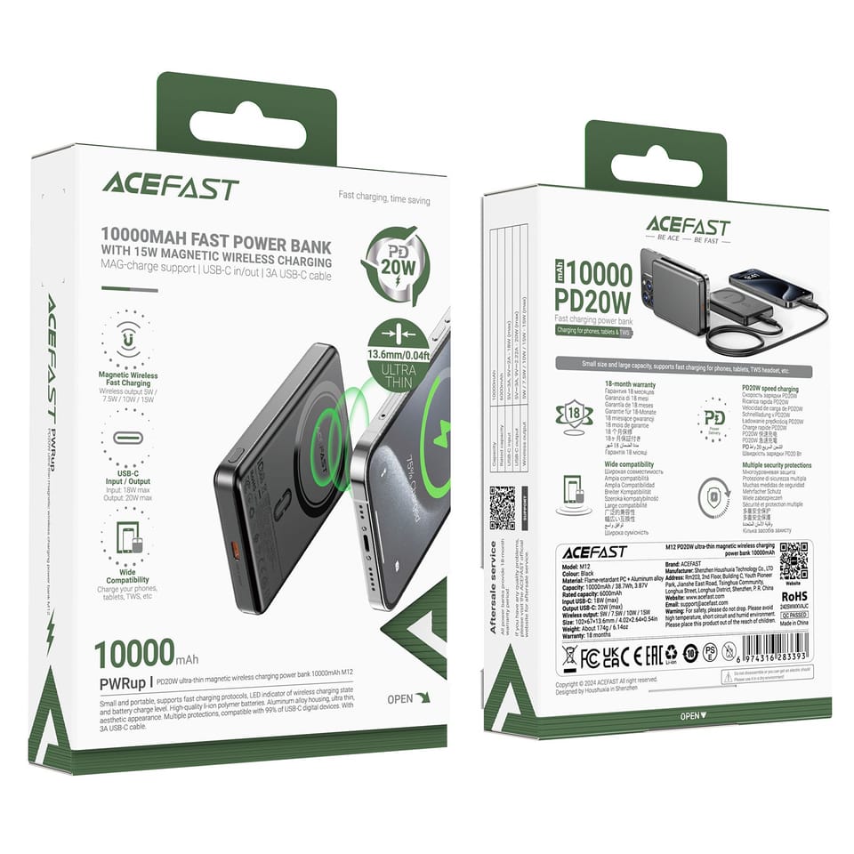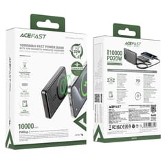 Kod produktu: 1027491Acefast M12 to ultra-cienki powerbank, który łączy nowoczesną funkcjonalność z wyjątkowym stylem. Dzięki pojemności 10 000 mAh i zgodności z MagSafe, ładowanie Twoich urządzeń staje się niezwykle wygodne i szybkie. Wyposażony w funkcję bezprzewodowego ładowania magnetycznego oraz port USB-C, oferuje uniwersalność i wydajność, które sprawdzą się w każdej sytuacji. Moc 20W PD pozwala na szybkie doładowanie baterii zarówno przewodowo, jak i bezprzewodowo. Z Acefast M12 możesz śledzić poziom naładowania dzięki intuicyjnemu wskaźnikowi LED, a wysokiej jakości bateria Li-Ion zapewnia niezawodność. Kompaktowa konstrukcja i zaawansowane zabezpieczenia sprawiają, że to idealny wybór do codziennego użytku oraz podróży.Ładowanie bezprzewodowe z MagSafeAcefast M12 umożliwia bezprzewodowe ładowanie za pomocą technologii MagSafe. Silne magnesy zapewniają stabilne połączenie, co pozwala na wygodne ładowanie bez użycia kabli.Szybkie ładowanie PD20W dla efektywnościDzięki mocy 20W Power Delivery, Acefast M12 zapewnia szybkie ładowanie zarówno przewodowo, jak i bezprzewodowo. To idealne rozwiązanie dla nowoczesnych urządzeń mobilnych.Kompaktowy i stylowy designUltra-cienka konstrukcja Acefast M12 sprawia, że jest on niezwykle poręczny i łatwy do przenoszenia. Doskonale sprawdzi się w każdej podróży lub w codziennym użytkowaniu.Wysokiej jakości bateria Li-IonPowerbank wyposażony jest w trwałą i niezawodną baterię litowo-jonową, która gwarantuje długą żywotność oraz stabilną wydajność ładowania.Bezpieczeństwo przede wszystkimAcefast M12 został wyposażony w zaawansowane zabezpieczenia, które chronią urządzenia przed przeładowaniem, przegrzaniem i przepięciami. To gwarancja spokoju podczas każdego ładowania.Najważniejsze cechy: