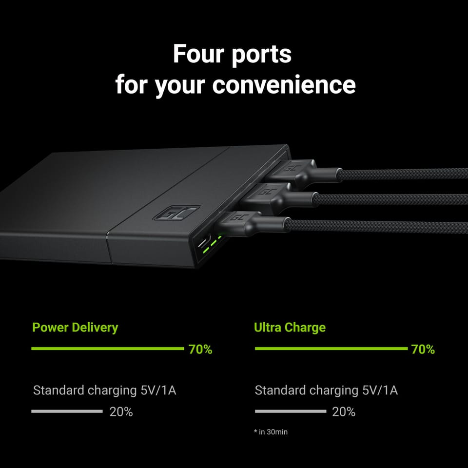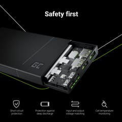 Power bank GC PowerPlay10S został wyposażony w 3 szybkie porty, dzięki którym możesz naładować do 3 urządzeń jednocześnie: port USB-C Power Delivery, który może służyć do ładowania urządzeń z mocą do 18W lub do ładowania Power Play'a, 2 porty USB-A wyposażone w autorską technologię Ultra Charge, oraz dodatkowo port USB-C dedykowany do błyskawicznego ładowania samego Power Banka.