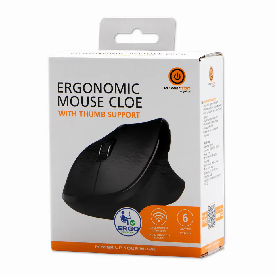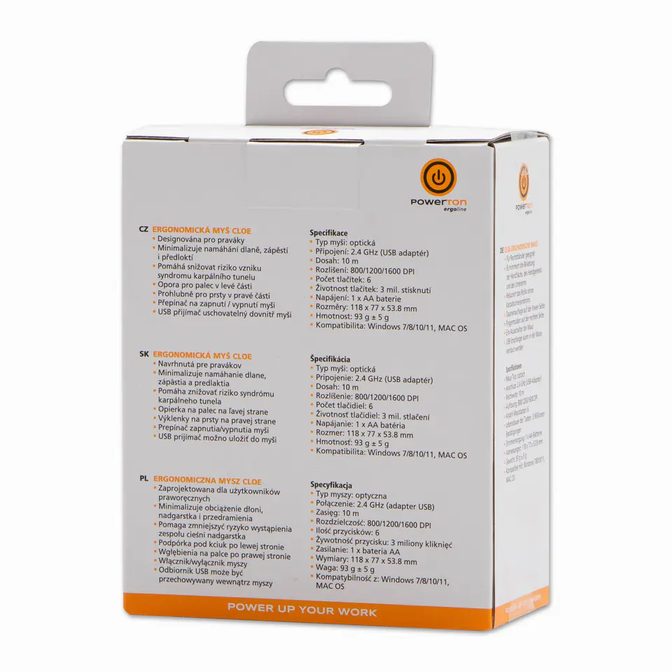 Ergonomiczna bezprzewodowa mysz Powerton CLOESzukasz myszy, która doskonale leży w dłoni, zapewnia ergonomiczną pozycję nadgarstka i jest przyjemna w dotyku? Wypróbuj mysz Powerton CLOE. Ta mysz optyczna oferuje 6 przycisków i regulowaną rozdzielczość do 1600 DPI. Aby przedłużyć czas działania baterii, posiada przełącznik włączania/wyłączania na dolnej stronie.Ergonomiczny designMysz jest ukształtowana w taki sposób, aby minimalizować obciążenie dłoni, nadgarstka i przedramienia. Oferuje wsparcie dla kciuka po lewej stronie i zagłębienie dla palców po prawej stronie. Dzięki temu ruch myszki jest bardzo precyzyjny, a myszka nie ślizga się w dłoni. Dzięki swojemu designowi pomaga zmniejszać ryzyko wystąpienia zespołu cieśni nadgarstka.Bezprzewodowa swobodaNajlepiej pracuje się, gdy nic Cię nie ogranicza, nawet kable. Myszka Cloe działa na zasadzie bezprzewodowego połączenia 2,4 GHz za pomocą adaptera USB. Jej zasięg wynosi nawet 10 metrów, dzięki czemu nic nie stanie na przeszkodzie swobodnemu poruszaniu myszką. Dzięki funkcji Plug & Play nie ma potrzeby instalowania sterowników ani oprogramowania. Po prostu podłącz i pracuj.Wbudowany odbiornikAdapter USB można schować na spodniej części myszy do pokrywy na baterię. Aby mieć pewność, że adapter nie zaginie się ani nie uszkodzi, myszka ma ułatwienie w postaci magnesu, który przyciąga i utrzymuje adapter.Niskie zużycie energiiMysz jest zasilana jednym akumulatorem typu AA, co pozwala na długotrwałe użytkowanie bez konieczności częstego ładowania. Myszka ta wytrzymuje nawet do 2 miesięcy przy codziennym użytkowaniu przez 8 godzin (w zależności od rodzaju baterii).Tryb oszczędzania energiiTryb uśpienia myszki CLOE to funkcja, która pozwala myszce przejść w stan oszczędzania energii, gdy nie jest aktywnie używana przez okres 15 minut. To znacznie zmniejsza zużycie energii i przedłuża żywotność baterii.Staramy się zminimalizować ilość plastiku w naszych produktach, dlatego ta mysz jest pakowana w kartonowe pudełko, a zamiast plastikowego woreczka znajduje się w papierowym opakowaniu.