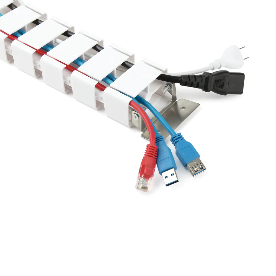 Idealny do biurek z regulacją wysokościKonstrukcja porusza się razem z blatem podczas zmiany jego pozycji, utrzymując przewody w estetycznym układzie oraz zapobiegając ich uszkodzeniu.