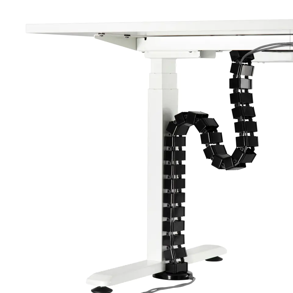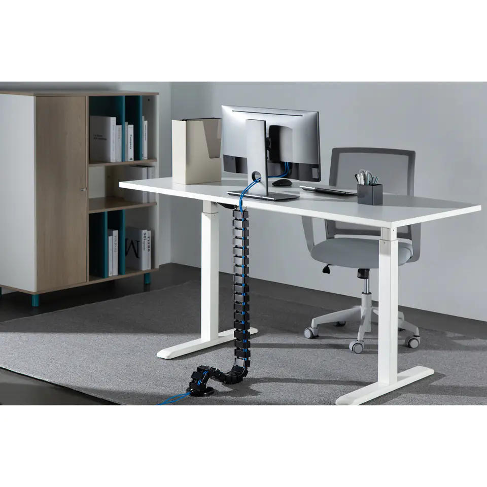 Idealny do biurek z regulacją wysokościKonstrukcja porusza się razem z blatem podczas zmiany jego pozycji, utrzymując przewody w estetycznym układzie oraz zapobiegając ich uszkodzeniu.
