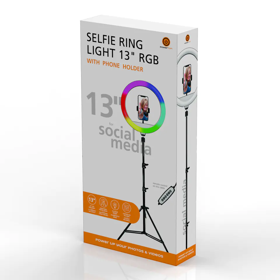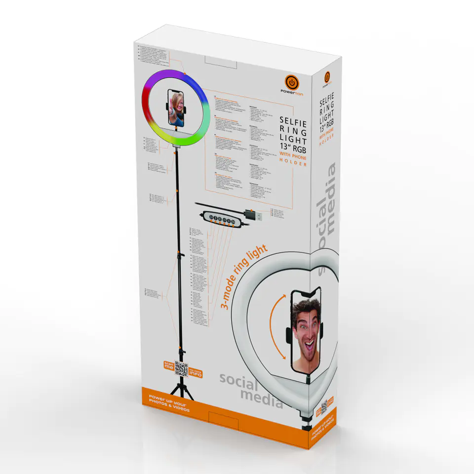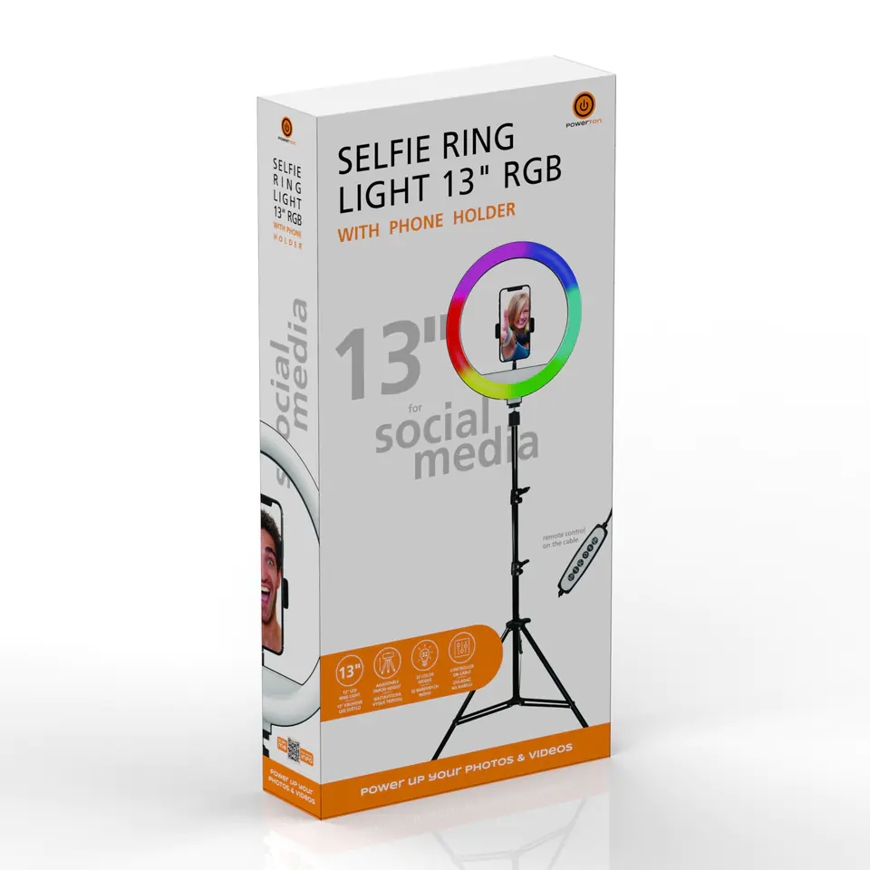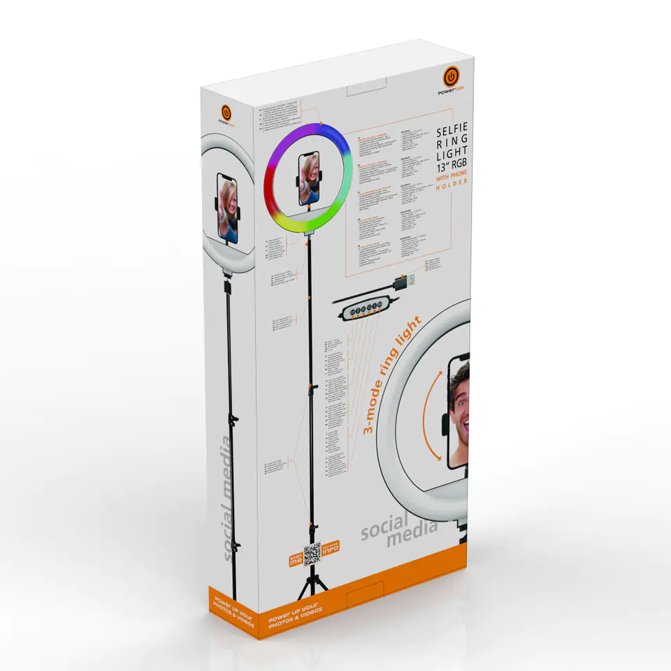 Specyfikacja technicznaŚrednica pierścienia 13 cali (33 cm)Liczba diod LED 212Maksymalna szerokość telefonu 94 mmZakres wysokości statywu 70 – 210 cmZasilanie USBNapięcie zasilania 5 V 2.4 AMoc wyjściowa 10 WDługość kabla 2 mZakres temperatury barwowej światła białego 2700 K – 7000 K