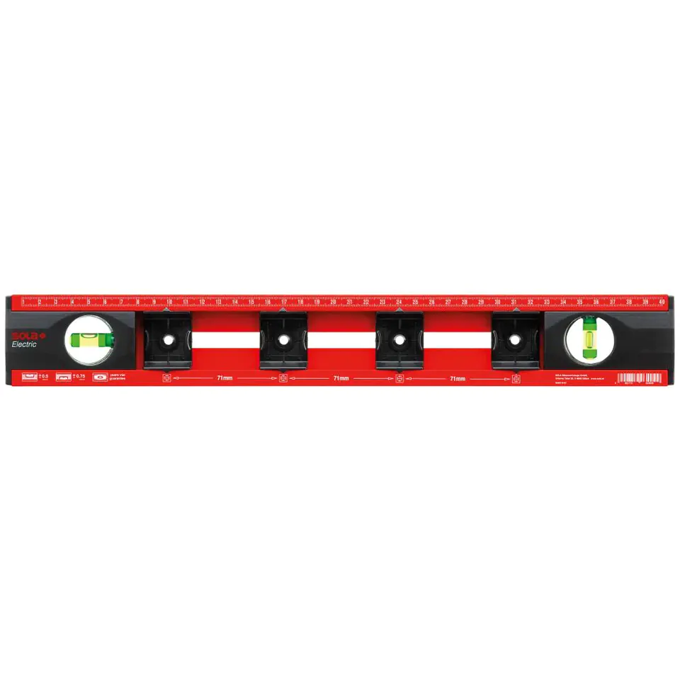 Wykonanie: z aluminium, profil C, powlekana. Nadrukowana podziałka milimetrowa. Dokładność pomiaru w pozycji normalnej 0,5 mm/m. Umożliwia wykonanie 4 znaczników w standardowej odległości 71 mm zgodnie z DIN 49075. Osłona z tworzywa sztucznego zapobiega przesuwaniu się poziomicy, jednocześnie chroniąc powierzchnię. Dokładność pomiaru w pozycji normalnej: 0,5 mm/m, dokładność pomiaru w pozycji odwróconej: 0,75 mm/m.