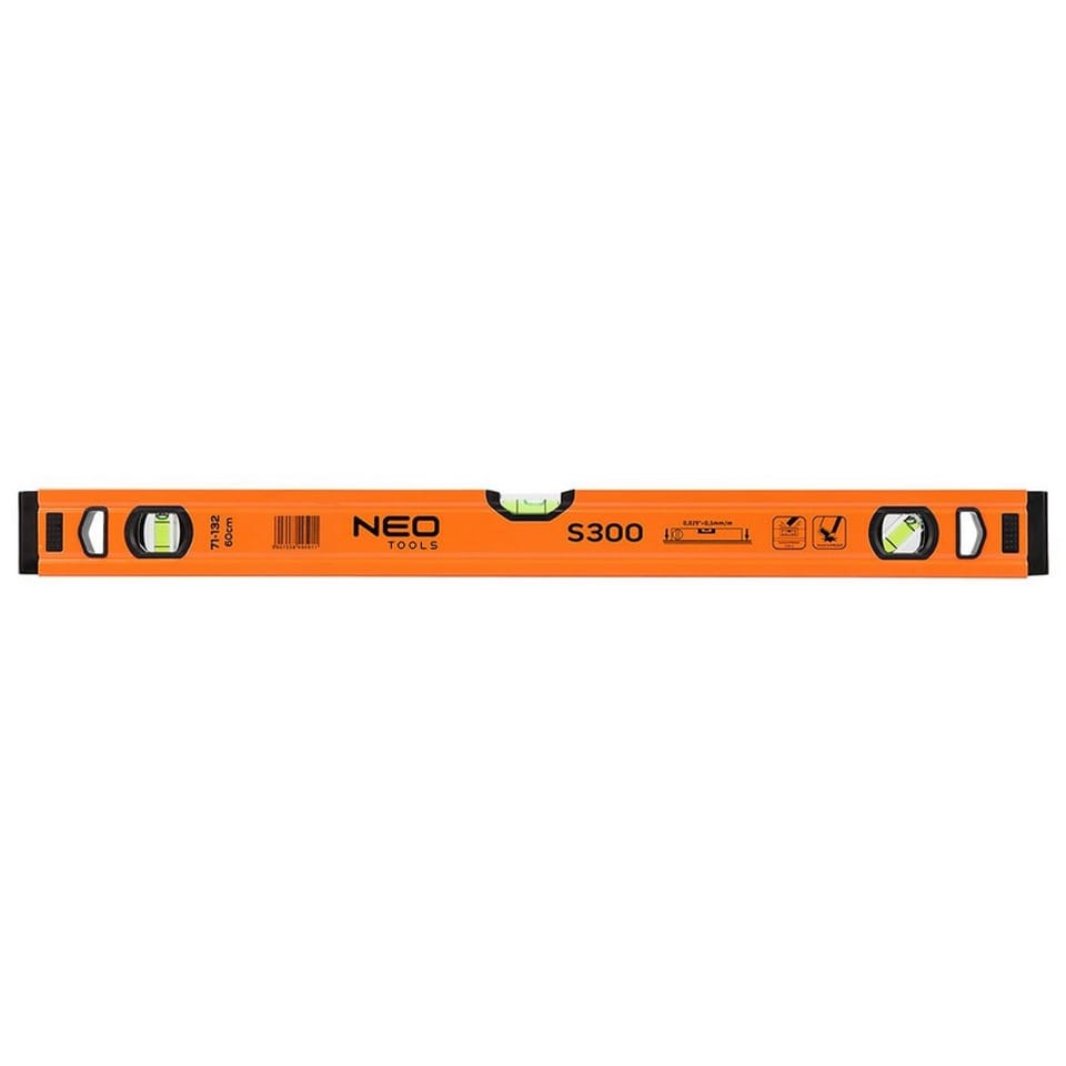 Poziomnica aluminiowa 60 cm, 3 libelle z systemem łatwego odczytu, 2 nasadki antywstrząsowe, grubość profilu 1.0 mm, gęstość 0.395 kg/m, dokładność 0.029°=0.5mm/m