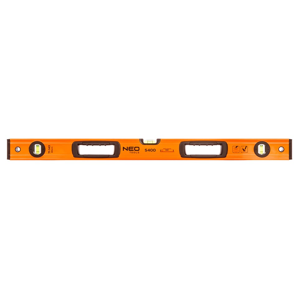 Poziomnica aluminiowa 80 cm, 3 libelle z systemem łatwego odczytu, 2 uchwyty, 2 nasadki antywstrząsowe, grubość profilu 1.2 mm, dokładność 0.029°=0.5mm/m
