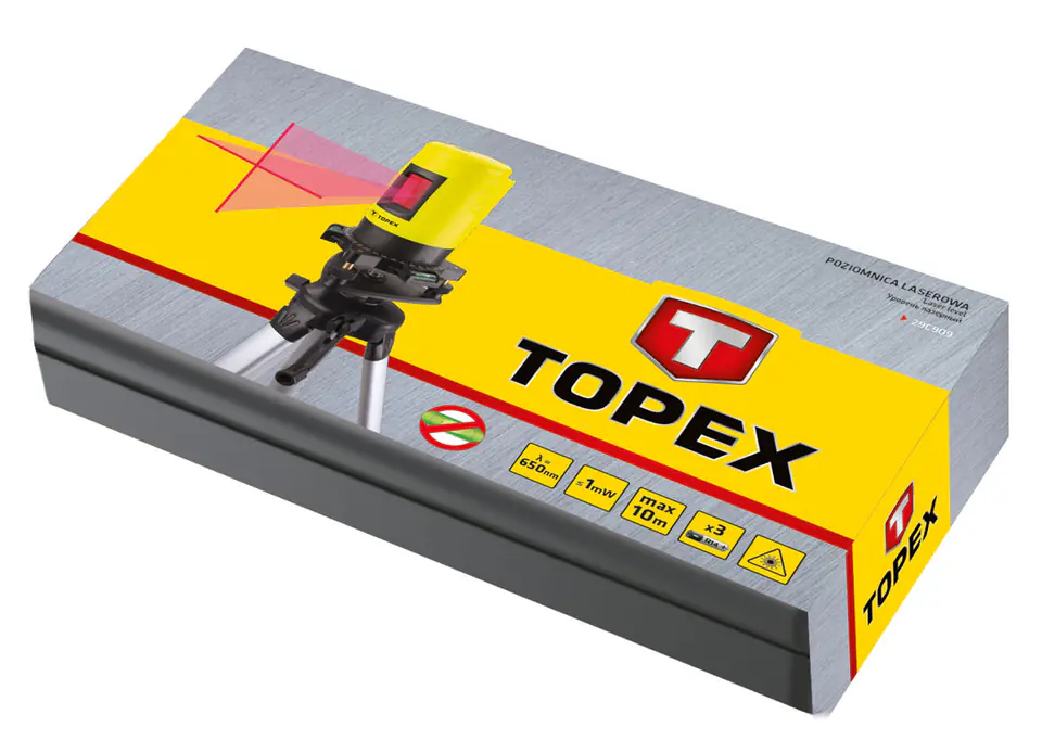 Poziomnica laserowa samopoziomująca, statyw, okulary, wyznaczanie linii pionowej, wyznaczanie linii poziomej, wyznaczanie linii krzyżowych, długość fali lasera 650 nm, klasa II, moc lasera 1 mW, zakres poziomowania < 6°, zasilanie: 3 baterie AA, zasięg do 10 m, masa 4.5 kg, walizka