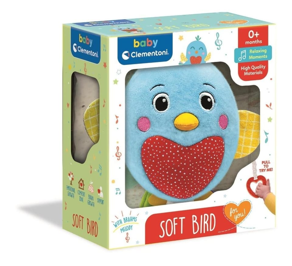 Sympatyczna maskotka Ptaszek, która zajmie dziecko i wyciszy je przed zaśnięciem. Po pociągnięciu za plastikowe serduszko włączy się pozytywka odtwarzająca muzykę Brahmsa. Dzięki praktycznemu uchwytowi maskotkę można zawiesić na łóżeczku lub wózku. Różnorodne materiały oraz plastikowy element pobudzają zmysły dziecka może ono bawić się ptaszkiem bądź włączać muzykę, ćwicząc w ten sposób rozumienie związków przyczynowo-skutkowych.