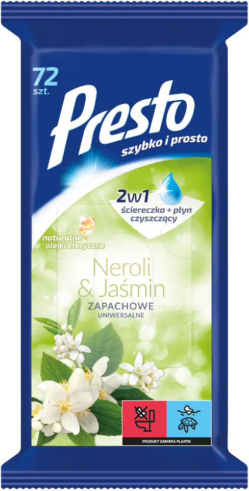 Ściereczki nawilżane Presto uniwersalne o zapachu Neroli & Jaśmin usuwają zabrudzenia ze wszystkich powierzchni gładkich (mebli i powierzchni laminowanych, terakoty i paneli podłogowych, ceramiki, glazury, tworzyw sztucznych). Intensywnie i długotrwale odświeżają wnętrza pozostawiając przyjemny zapach.
