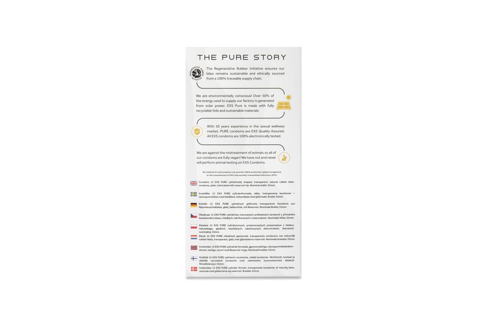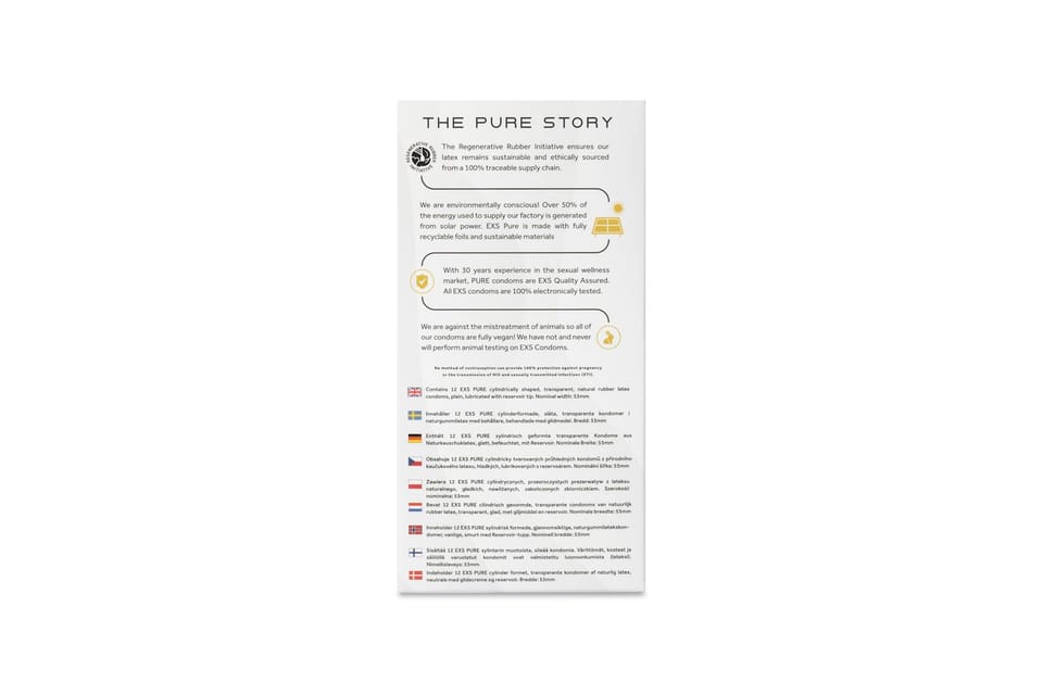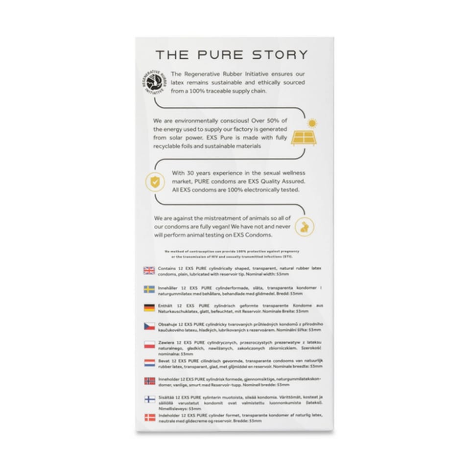 PURE - Wykonane przy użyciu ultracienkiej technologii lateksowej EXS Pure mają wygodne dopasowanie, dzięki czemu czujesz się tak, jakbyś w ogóle nie nosił prezerwatywy.CO - Prezerwatywy EXS to zakończone wypustkami prezerwatywy z naturalnego lateksu, smarowane silikonem. W przeciwieństwie do wielu prezerwatyw, prezerwatywy EXS nie mają zapachu lateksu, maksymalizując przyjemność.PRZYJAZNE DLA ŚRODOWISKA I BEZPIECZNE - folia i opakowanie EXS Pure w pełni nadają się do recyklingu, w przeciwieństwie do większości innych marek. Lubimy również robić swoje podczas procesu produkcyjnego, a także w naszej fabryce działającej w ponad 50% na odnawialnej energii słonecznej i jesteśmy dumni z tego, że jesteśmy wolni od okrucieństwa i nie przeprowadzamy żadnych testów na zwierzętach.ZRÓWNOWAŻONY - EXS Pure jest inspirowany sprawiedliwością, równością i zrównoważonym rozwojem. Wykonane z lateksu RRI (Regenerative Rubber Initiative), który chroni lasy rolne, a jednocześnie wspiera niezależnych rolników lateksowych, aby zapewnić im uczciwe wynagrodzenie i możliwość dalszego wspierania ich gospodarstw i rodzin.WHY EXS - Jeśli uważasz, że prezerwatywy przeszkadzają, to kupujesz niewłaściwe, wypróbuj naszą gamę produktów. Nie bez powodu jesteśmy największym niezależnym dostawcą prezerwatyw w Wielkiej Brytanii! Uwaga: opakowania mogą się różnić.