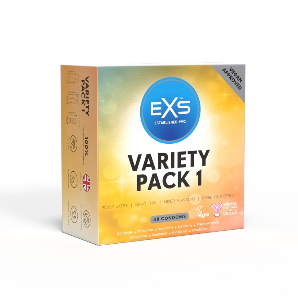Variety Pack 1 -VARIETY PACK - Variety Pack 1 zawiera 7 najlepiej sprzedających się prezerwatyw EXS w mieszanym opakowaniu! Od smacznych smaków po ultracienkie, a nawet prążkowane i kropkowane!CO - Prezerwatywy EXS to zakończone wypustką, wykonane z naturalnego lateksu i nasmarowane silikonem prezerwatywy. W przeciwieństwie do wielu prezerwatyw, prezerwatywy EXS nie mają zapachu lateksu, maksymalizując przyjemność.ZAWARTOŚĆ - zawiera 12 prezerwatyw Nano Thin, 6 Chocolate, 6 Cola, 6 Strawberry, 6 Bubblegum, 6 Black Latex i 6 Ribbed & Dotted.PRZYJAZNE WEGANOM I BEZ OKRUCIEŃSTWA - Jesteśmy i zawsze będziemy przyjaźni weganom. Jesteśmy dumni z tego, że jesteśmy wolni od okrucieństwa i nie testujemy produktów na zwierzętach.WHY EXS - Jeśli uważasz, że prezerwatywy przeszkadzają, to kupujesz niewłaściwe, wypróbuj naszą gamę produktów. Nie bez powodu jesteśmy największym niezależnym dostawcą prezerwatyw w Wielkiej Brytanii! Uwaga: opakowanie może się różnić.