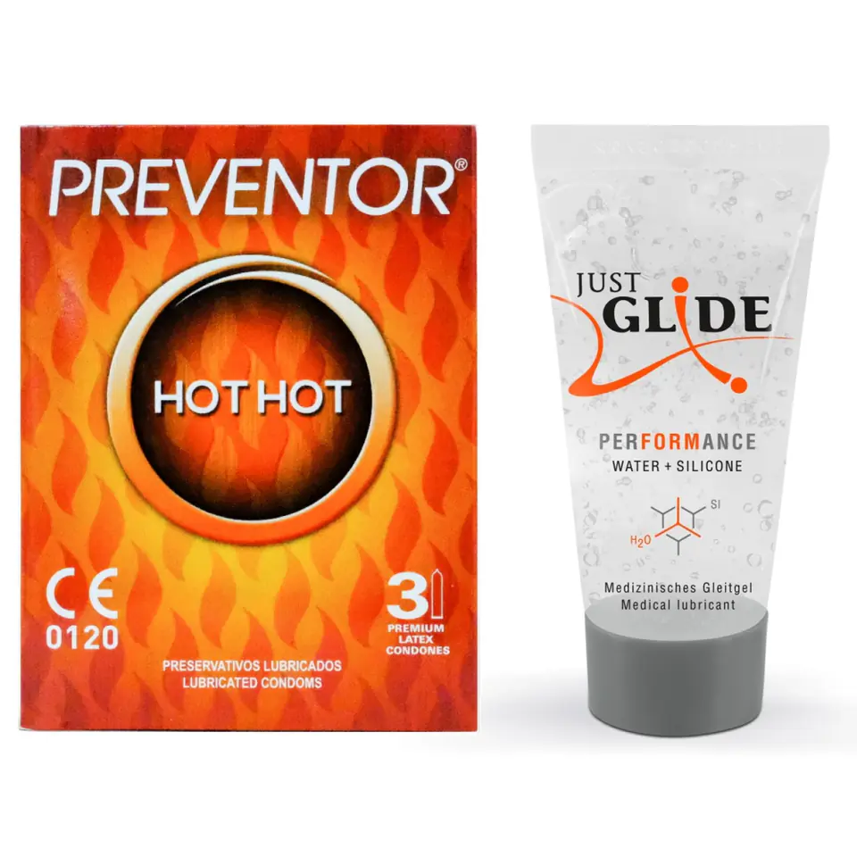 Zestaw składający opakowania prezerwatyw Preventor Hot Hot 3 szt. i lubrykantu Just Glide Performace 20ml