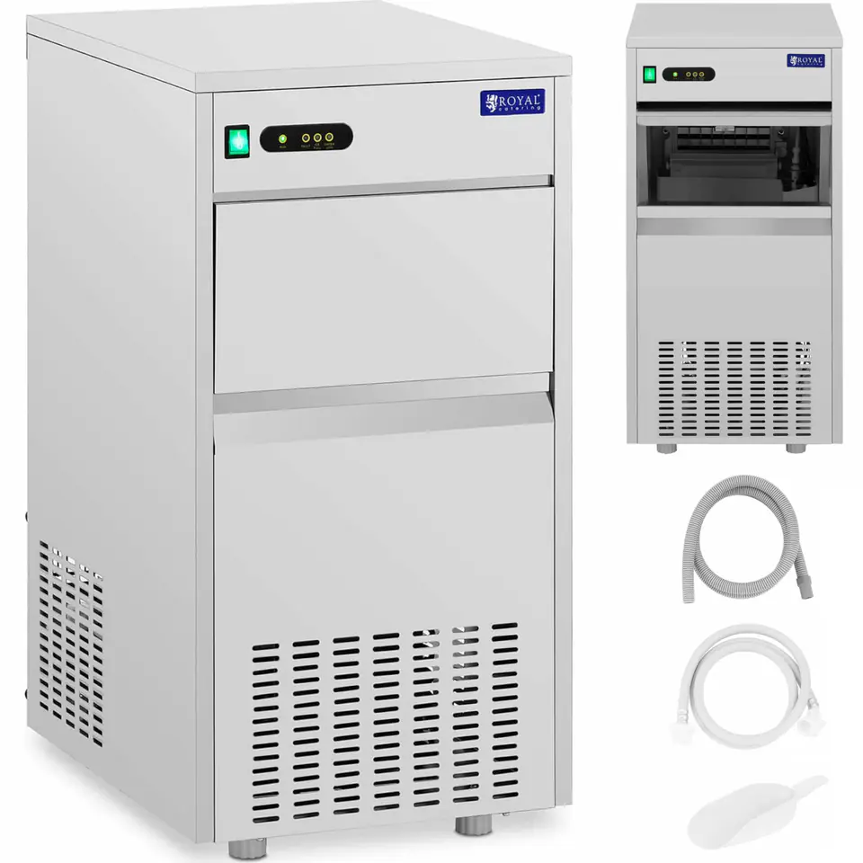 Kod producenta: 10012821Kostkarka do lodu marki Royal Catering dzięki mocy 240 W wytwarza do 30 kg/24 h. W jednym cyklu produkcyjnym maszynka wytwarza 40 kostek lodu o wielkości 22 x 22 x 22 mm. Wykonana w całości ze stali nierdzewnej maszyna świetnie sprawdzi się w barach, restauracjach i wszędzie tam, gdzie niezbędne są schłodzone napoje. Urządzenie dzięki swojej szybkości i wydajności jest niezwykle użyteczna w branży gastronomicznej. Jednocześnie wyróżnia się wysoką pojemnością 7 kg i intuicyjną obsługą. Kostkarka do lodu ma do tego przejrzysty panel sterowania. Miarka do wyjmowania i porcjowania lodu jest zawarta w zakresie dostawy. Stal nierdzewna, z której wykonano kostkarkę zachwyca niewrażliwością na czynniki zewnętrzne i wysoką odpornością na korozję, a przede wszystkim przekonuje łatwym czyszczeniem. Maszyna do kostek lodu ma przemyślaną konstrukcję. Wywietrzniki z boku i z przodu urządzenia zapewniają przyjemną atmosferę w kuchni lub za barem. Zapobiegają bowiem przedostawaniu się ciepłego powietrza bezpośrednio do otoczenia. Przy emisji dźwięku 62 dB kostkarka do lodu działa przyjemnie cicho.Cechy produktu: