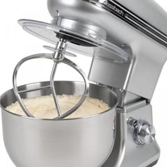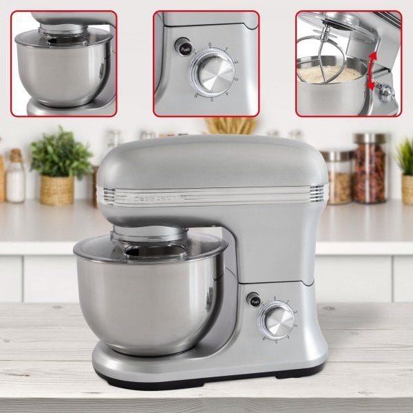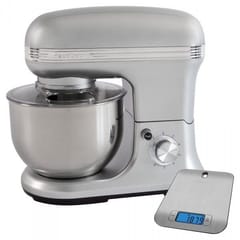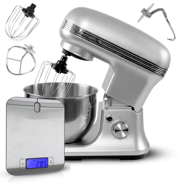 Profesjonalny robot planetarny Classbach C-KM 4004 W + cyfrowa waga kuchenna SKU: 414004Classbach C-KM 4004 W to profesjonalny mikser do zgniatania ciasta z trwałym silnikiem o mocy aż 1200 W. Urządzenie sprawi, że przygotowywanie ciast oraz deserów stanie się jeszcze łatwiejsze i przyjemniejsze. Idealne rozwiązanie nie tylko dla zaawansowanych, ale również początkujących mistrzów pieczenia. Dzięki systemowi mieszania planetarnego uzyskamy doskonale wyrobione ciasto. Wydajna trzepaczka przygotuje puszysty biszkopt oraz ubije idealnie białko - wszystko to bez brudzenia kuchni dzięki zabezpieczeniu przed rozpryskiwaniem w postaci transparentnej pokrywy.Do wyboru mamy 8 biegów, które pozwalają w optymalny sposób dostosować prędkość urządzenia do aktualnych potrzeb - dodatkowo urządzenie jest wyposażone w bieg pulsacyjny.Robot charakteryzuje się nowoczesnym designem oraz kolorystyką pasującą do każdej kuchni.Do zestawu dołączona jest funkcjonalna waga kuchenna która pozwoli na precyzyjnie odważanie składników do przygotowywania potraw.Najważniejsze cechy planetarnego robota kuchennego Classbach C-KM 4004 W:Kolor: srebrnyMoc 1200 WMasywna aluminiowa obudowa odlewana ciśnieniowo zapewniająca dużą stabilność urządzeniaSolidny mechanizm zapewniający trwałość i wysoką wydajność urządzeniaStała moc dzięki elektronicznej regulacji obrotów zależnej od obciążenia8 ustawień prędkości (0-1-2-3-4-5-6 + pulsowanie)Płynny rozruch umożliwiający powolne mieszaniePodświetlane pokrętło regulacyjneMiska ze stali nierdzewnej o pojemności 5.0 litrów, do przygotowania maksymalnie 2.5–3 kg ciastaUchylne, wielofunkcyjne ramię z mechanizmem odblokowaniaPrzeźroczysta pokrywa z otworem do napełniania (zdejmowana)Wyłącznik bezpieczeństwa – działa w przypadku ramienia wychylnegoOdlewane ciśnieniowo aluminiowe haki do ugniatania ciężkich mas na przykład ciasta drożdżowego lub na chlebOdlewane ciśnieniowo aluminiowe haki do mieszania ciasta na kruszonki i biszkopty itp.Trzepaczka ze stali nierdzewnej do ubijania jajek, śmietany i innych produktówŁatwe w obsłudze i utrzymaniu czystościStabilna i bezpieczna pozycja dzięki nóżkom na przyssawkachUchwyt do szybkiego mocowania narzędziSolidne ramię przestawne (35°)Zasilanie: 220-240 V, 50-60 HzZestaw zawiera 3 odlewane ciśnieniowo końcówki:Hak do zagniatania i wyrabiania ciężkich składników takich jak ciasto na chleb, bułki, wyrabianie ciasta na makaron, pierogowe, drożdżowe, faworkowe, pierniki itp. oraz wstępnego mieszania składników.Mieszadło do ucierania i miksowania średnich składników takich jak gęste kremy, ciasto na naleśniki, biszkoptowe, ser na sernik, pasztety, farsze, mięso mielone, lukru, nadzienia, eklerów, ziemniaków puree itp.Trzepak do ubijania lekkich składników takich jak piany z białek, jajek, śmietany, kremów gotowych, budyniu, majonezu, musów, sufletów, panierki, wyrabiania lekkich ciast biszkoptowych bez tłuszczu itp.Najważniejsze cechy cyfrowej wagi kuchennej:Powierzchnia ważąca wykonana ze stali nierdzewnejDuży, podświetlony na niebiesko wyświetlacz LCDZakres pomiarowy do 5000 g (w krokach co 1 g)Regulowane jednostki miary: kg, g, lb, ozAutomatyczne wyłączanie wydłuża żywotność bateriiFunkcja tary (funkcja doważania)Praktyczna pętla do zawieszaniaWskaźnik niskiego poziomu bateriiZasilanie bateryjne: 2x AAA (zestaw nie zawiera baterii)Dlaczego warto kupić robot Classbach C-KM ?Wielofunkcyjny8 stopniowa regulacja prędkości pozwala na dokładny dobór obrotów do przyrządzanego pożywieniaSolidnyMasywna aluminiowa obudowa odlewana ciśnieniowo oraz mocna konstrukcja przekładni napędu gwarantują trwałość urządzeniaDuża moc pod kontroląStała, duża moc 1200 W i możliwość regulacji obrotów umożliwiają dokładne przyrządzenie masy ciastaBogaty w akcesoriaDuża ilość akcesoriów umożliwi zastąpienie wielu urządzeń jednymIdealny na prezentUrządzenie posiada eleganckie opakowanie, dzięki czemu idealnie sprawdzi się, jako prezent!Wymiary robota planetarnego oraz wagi:Wymiary (ok. szer. x wys. x gł.) i wagaRobot: 390 x 360 x 230 mm; 5.04 kgWaga: 165 x 15 x 220 mm; 0.40 kgOpakowanie: 413 x 384 x 244 mm; 6.2 kg...