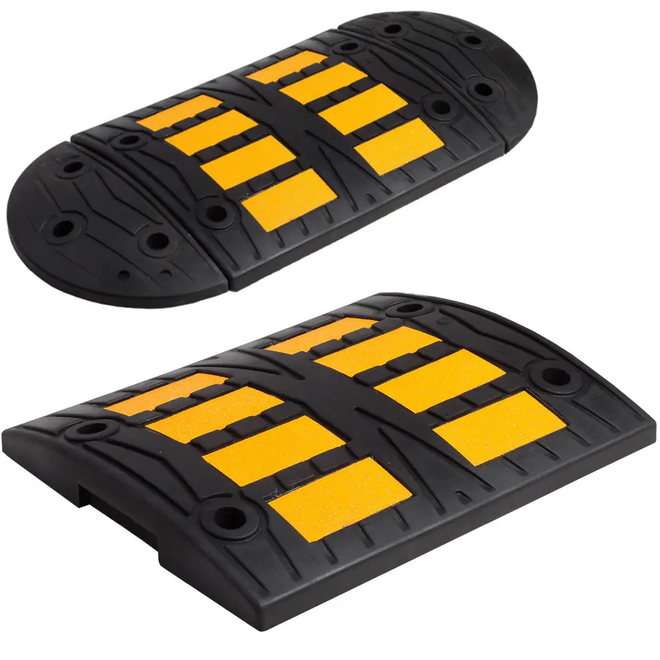 Kod producenta: P019Próg zwalniający marki PRO-LINE przeznaczony został do spowalniania ruchu samochodowego. Wykonany jest w 100% z recyclingu gumy oponiarskiej. Charakteryzuje się wysoką odpornością na uszkodzenia, niskie i wysokie temperatury. Na progu umieszczone zostały żółte odblaski, poprawiające widoczność. Segmentowa budowa ułatwia transport.Typ mocowania progu do nawierzchni dobiera się w zależności od przewidywanego charakteru obciążenia progu ruchem drogowym: