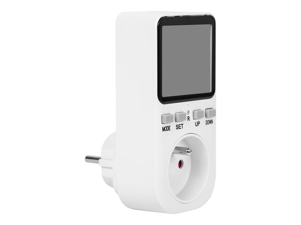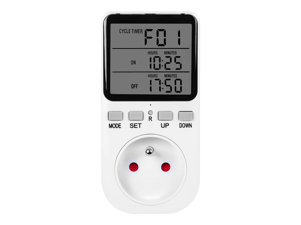 Wbudowany timer obsługuje 4 różne tryby pracy (F01-F04), co pozwala na ustawienie cyklicznych włączeń i wyłączeń, opóźnień startu i zatrzymania oraz ich kombinacji. Zakres odliczania to aż 99 godzin i 59 minut!