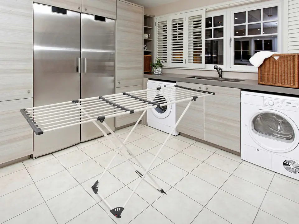 Suszarka pozioma, stojąca, posiada rozsuwane skrzydła, które umożliwiają suszenie większej ilości ubrań. Skrzyła są teleskopowe, a nie jak w większości suszarek składane (do środka). Dzięki temu skrzydła wysuwasz tylko wówczas gdy jest potrzeba. Dzięki grubym drutom zapobiega powstawaniu zagnieceń na częściach garderoby jednocześnie skracając proces prasowania.