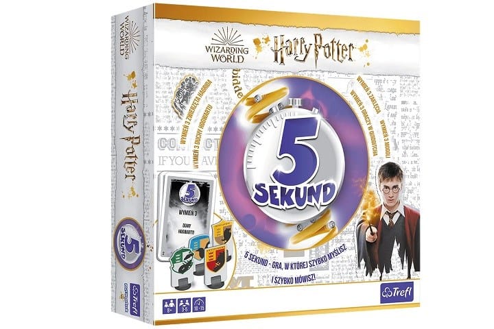 5 Sekund Harry Potter to zupełnie nowa gra z bestsellerowej serii 5 Sekund, osadzona w magicznym świecie czarodziejów! Sprawdź, ile wiesz o świecie Harry’ego, Rona i Hermiony. Czy potrafisz wymienić trzech profesorów magii lub zwierzęta znajdujące się w herbach Domów? Z grą 5 Sekund Harry Potter emocje sięgają zenitu! Wylosuj kartę i spróbuj odpowiedzieć na pytanie, zanim czasomierz odmierzy czas. Spiesz się, masz tylko 5 sekund... Nie wymieniłeś trzech poprawnych odpowiedzi? Uwaga, kolejny gracz ma jeszcze trudniej! Odpowiedzi nie mogą się powtórzyć! Zbierz znajomych i sprawdźcie swój refleks w szalonej rozgrywce, w której czas nie jest Waszym sprzymierzeńcem. 5 Sekund to gra, w której szybko myślisz i szybko mówisz! Cechy gry:• Gra towarzyska, rodzinna • Znana i lubiana na całym świecie mechanika• Czas na odpowiedź odmierza specjalny czasomierz wydający rozpraszający dźwięk• Szybka, dynamiczna rozgrywka• Proste zasady• Ponad 400 unikatowych pytań Gra rozwija:• Zdolność szybkiego myślenia• Kreatywność i pomysłowość• Umiejętność działania pod presją czasu• Zdolność zdrowej rywalizacji 5 sekund - tyle wystarczy, by twoje serce zabiło szybciej, a mózg wskoczył na wyższy bieg!Pokochałeś dreszczyk emocji i dobrą zabawę z 5 Sekund Harry Potter? Poznaj pozostałe gry z serii i ciesz się nowymi pytaniami! Poznaj Gry Trefl i podziel się radością z rozgrywki. Gry planszowe to doskonały prezent z okazji urodzin, Dnia Dziecka lub pod choinkę. Świetnie sprawdzą się podczas spotkania towarzyskiego oraz chwil spędzanych w gronie rodzinnym. Zawartość pudełka:• 204 karty z pytaniami (408 pytań)• 2 karty na pytania własne• 5 kart "Zaklęcie rozbrajające"• 5 kart "Transmutacja"• 5 pionków do gry• 5 podstawek pod pionki• plansza do gry• 1 specjalny czasomierz - klepsydra• 1 pudełko na karty• instrukcja Wymiary pudełka: 260x260x60 Ilość Graczy: 3-5Średni czas rozgrywki: 10- 15 minWiek: 8 +
