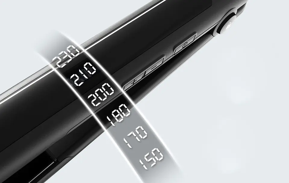 Dostosuj działanie prostownicy do swoich oczekiwań i typu włosów. Urządzenie umożliwia regulację temperatury w zakresie 150-230°C (290-450°F). Naciskając odpowiedni przycisk, możesz ją zwiększyć lub zmniejszyć o 10°C (20°F). 150-170°C (290-338°F) sprawdzi się w wypadku włosów delikatnych, a 180-200°C (356-392°F) nada się do włosów normalnych. Jeśli Twoje włosy są gęste i sztywne, wybierz 210-230° (410-450°F). Możesz też dostosować jednostkę: °C lub °F.