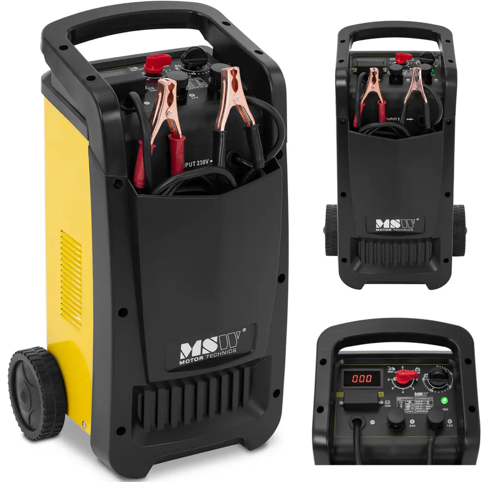 Kod producenta: 10062366Profesjonalny i kompaktowy prostownik samochodowy marki MSW pozwala szybko i łatwo uruchomić auto, aby znów ruszyło. Nie pozwala on rozładować się baterii i ładuje ją, gdy zacznie tracić moc. Niezależnie od tego, czy uruchamiany jest silnik benzynowy, czy silnik Diesla, prostownik pozwala przygotować się na każdą ewentualność. Ładowarka o maksymalnym prądzie rozruchowym 480 A niezawodnie zapewnia szybki rozruch, nawet jeśli akumulator samochodowy jest rozładowany. Przyda się zwłaszcza w warsztacie samochodowym, gdzie silnik jest często uruchamiany tylko na krótki czas, a akumulator nie ma szans na prawidłowe naładowanie. Urządzenie zapewnia szybki rozruch, który zużywa maksymalnie 8500 / 12000 W. Prostownik umożliwia niezawodne ładowanie akumulatorów o pojemności 60 - 1000 Ah. Jednocześnie z prądem 100 A zapewnia wyjątkowo szybkie czasy ładowania. Napięcie wyjściowe 12 V lub 24 V pozwala na zastosowanie urządzenia z większymi pojazdami, takimi jak ciężarówki. Po szybkim naładowaniu bateria jest ponownie gotowa do użytku. Przed podłączeniem prostownika należy sprawdzić, czy akumulator ma zalecaną pojemność. Czas ładowania ustawiany jest do 60 min za pomocą timera. Trzycyfrowy wyświetlacz LED pokazuje wszystkie ustawione wartości i odpowiedni poziom naładowania. Wbudowany bezpiecznik chroni urządzenie przed zwarciem w przypadku podłączenia klem o niewłaściwej polaryzacji. Ładowarka samochodowa zachwyca kompaktową konstrukcją, oraz licznymi przydatnymi elementami. Specjalne kieszenie umożliwiają przechowywanie długich przewodów i utrzymanie porządku w warsztacie. Kółka i dopasowane uchwyty pozwalają łatwo przenieść ładowarkę z jednego samochodu do drugiego.Cechy produktu: