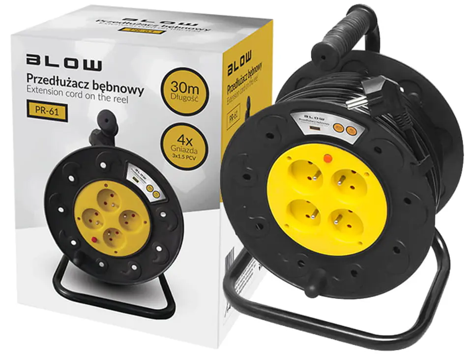 Przedłużacz sieciowy PR-61 o długości 30 m na bębnie ze stojakiem i uchwytem oraz 4 gniazdami z uziemieniem.