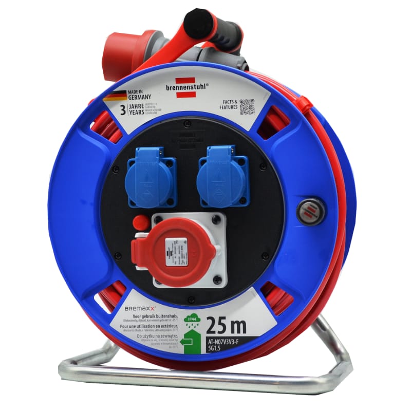 Przedłużacz bębnowy GARANT CEE to mocny i stabilny przedłużacz na stalowej ramie z 25 metrowym kablem Bremaxx. Przewód o parametrach AT-N07V3V3-F 5G1,5 jest odporny na oleje, promieniowanie UV przeznaczony do pracy na zewnątrz w temperaturze do -35°C. Uchwyt Cablepilot ułatwia zwijanie przewodu i jego wprowadzenie wzdłuż ramy nośnej. Uchwyt do przenoszenia został wyposażony w dziurki które umożliwiają przechowywanie wtyczki w uchwycie.