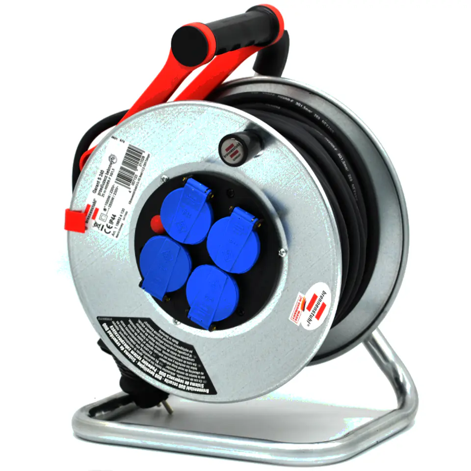 Przedłużacz bębnowy linii Garant S cechuje się ocynkowaną stalową ramą nośną. Wyposażony w 4 gniazda z ochroną IP44 i wyłącznik termiczny przeciw przeciążeniu i przegrzaniu, 25m przewód RR do krótkotrwałego użytkowania na wolnym powietrzu i nieograniczonego użytkowania w zamkniętym pomieszczeniu. Dodatkowo przedłużacz posiada uchwyt Cablepilot dla łatwego przenoszenia i dwa otwory na umieszczenie wtyczki by uniknąć rozwijania się przewodu podczas transportu. Stabilna konstrukcja i innowacyjne rozwiązania to cechy charakterystyczne produktów firmy Brennenstuhl.