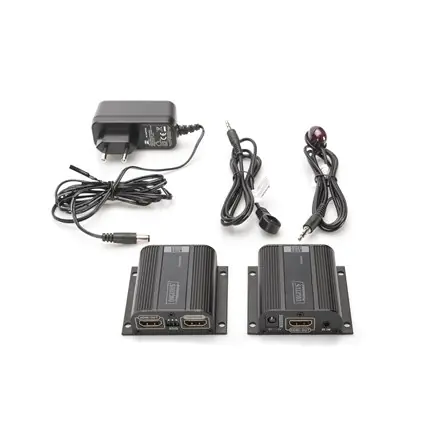Zestaw przedłużacza Digitus HDMI, Full HD to rozwiązanie do przedłużania sygnału wideo do 50 m spełniające najwyższe wymagania. Przesyła cyfrowe sygnały wideo i audio na maksymalną długość do 50 m. Najwyższa obsługiwana rozdzielczość wideo to 1080p/60Hz. Na jednostce nadajnika znajduje się przełącznik EDID-Switch, dzięki któremu można regulować rozdzielczość oraz format audio sygnału wyjściowego. Na nadajniku znajduje się również port HDMI Loop Out, który umożliwia podłączenie lokalnego monitora. Dzięki obsłudze kabla PoC (power over cable) jednostka nadajnika musi jednak posiadać zasilanie elektryczne. W zestawie znajdują się dwa dwukierunkowe moduły na podczerwień (nadajnik, odbiornik), poprzez które można za pomocą pilota zdalnie sterować podłączonym źródłem sygnału wejściowego.