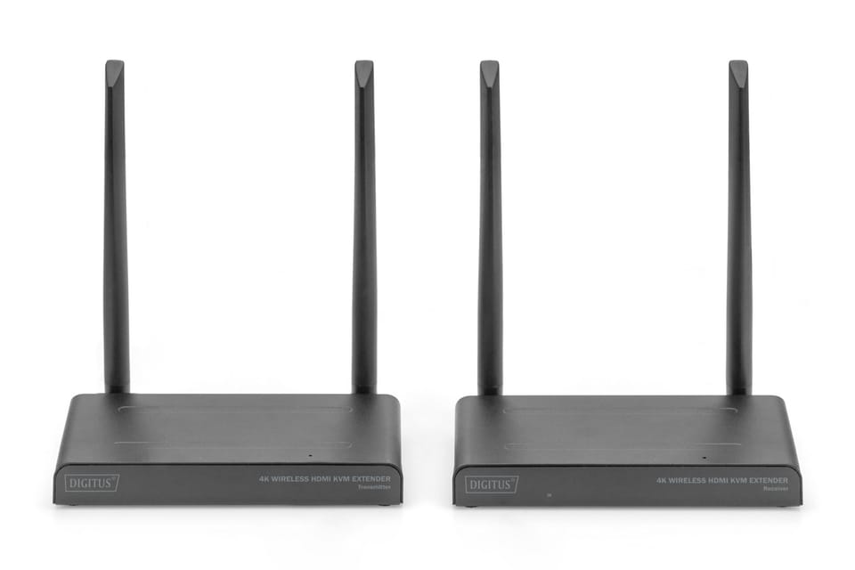 Zestaw 4K Wireless HDMI KVM Extender przesyła bezprzewodowo sygnały wideo i audio HDMI w rozdzielczości UHD 4K / 30Hz na odległość do 150 m (przy braku przeszkód w linii prostej). Obejmuje moduł nadajnika i odbiornika. Dzięki funkcjonalności KVM można podłączyć mysz/klawiaturę do jednostki odbiornika, którymi można sterować źródłem sygnału bezpośrednio na urządzeniu wyjściowym. Przy użyciu HDMI-Loop-Out w jednostce przekaźnikowej można podłączyć lokalny monitor do monitorowania sygnału wyjściowego w odbiorniku. Zestaw extendera można rozszerzyć do maksymalnie 4 odbiorników (urządzeń wyjściowych) dodatkowe odbiorniki są dostępne osobno: DS-55329.