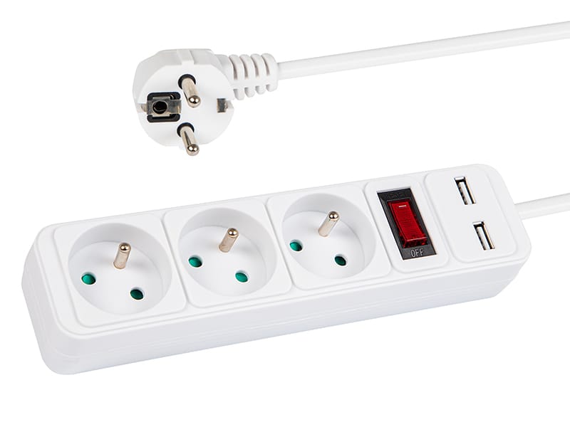 Przedłużacz sieciowy BLOW w kolorze białym z trzema gniazdami przeznaczony do użytku domowego oraz dwoma gniazdami USB. Przedłużacz pozwala podłączyć urządzenia, które są oddalone od gniazda elektrycznego, również na ładowanie urządzenia przez USB. Produkt z jednej strony posiada 3 gniazda obrócone pod kątem oraz włącznik, a z drugiej pojedynczy kątowy wtyk sieciowy.